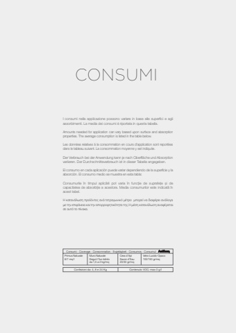CONSUMII consumi nella applicazione possono variare in base alle superfici e agli assorbimenti. La media dei consumi %u00e8 riportata in questa tabella.Amounts needed for application can vary based upon surface and absorption properties. The average consumption is listed in the table below.Les donn%u00e9es relatives %u00e0 la consommation en cours d%u2019application sont report%u00e9es dans le tableau suivant. La consommation moyenne y est indiqu%u00e9e.Der Verbrauch bei der Anwendung kann je nach Oberfl%u00e4che und Absorption variieren. Der Durchschnittsverbrauch ist in dieser Tabelle angegeben.El consumo en cada aplicaci%u00f3n puede variar dependiendo de la superficie y la absorci%u00f3n. El consumo medio se muestra en esta tabla:Consumurile %u00een timpul aplic%u0103rii pot varia %u00een func%u021bie de suprafe%u021be %u0219i de capacitatea de absorb%u021bie a acestora. Media consumurilor este indicat%u0103 %u00een acest tabel.%u0397 %u03ba%u03b1%u03c4%u03b1%u03bd%u03ac%u03bb%u03c9%u03c3%u03b7 %u03c0%u03c1%u03bf%u03ca%u03cc%u03bd%u03c4%u03bf%u03c2 %u03b1%u03bd%u03ac %u03c4%u03b5%u03c4%u03c1%u03b1%u03b3%u03c9%u03bd%u03b9%u03ba%u03cc %u03bc%u03ad%u03c4%u03c1%u03bf %u03bc%u03c0%u03bf%u03c1%u03b5%u03af %u03bd%u03b1 %u03b4%u03b9%u03b1%u03c6%u03ad%u03c1%u03b5%u03b9 %u03b1%u03bd%u03ac%u03bb%u03bf%u03b3%u03b1 %u03bc%u03b5 %u03c4%u03b7%u03bd %u03b5%u03c0%u03b9%u03c6%u03ac%u03bd%u03b5%u03b9%u03b1 %u03ba%u03b1%u03b9 %u03c4%u03b7%u03bd %u03b1%u03c0%u03bf%u03c1%u03c1%u03bf%u03c6%u03b7%u03c4%u03b9%u03ba%u03cc%u03c4%u03b7%u03c4%u03b1 %u03c4%u03b7%u03c2. %u0397 %u03bc%u03ad%u03c3%u03b7 %u03ba%u03b1%u03c4%u03b1%u03bd%u03ac%u03bb%u03c9%u03c3%u03b7 %u03b1%u03bd%u03b1%u03c6%u03ad%u03c1%u03b5%u03c4%u03b1%u03b9 %u03c3%u03b5 %u03b1%u03c5%u03c4%u03cc %u03c4%u03bf %u03c0%u03af%u03bd%u03b1%u03ba%u03b1.Muro NaturaleSegui il Tuo Istintoda 1,5 a 2 kg/mqCera d%u2019ApiSavon d%u2019Eau20/30 gr/mqVetro Lucido-Opaco100/150 gr/mqConsumi - Coverage - Consommation - Ergiebigkeit - Consumos - Consumul - %u0391%u03c0%u03cc%u03b4%u03bf%u03c3%u03b7Primus Naturale6/7 mq/lConfezioni da: 4, 8 e 24 Kg Contenuto VOC: max 0 g/l
