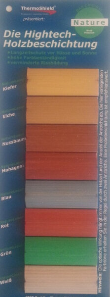 Eine farblose Variante mit reflektiver Membrantechnologie bieten wir derzeit nicht an. Die Basisbeschichtung ist milchig-weiß., Farbtöne: Kiefer, Eiche, Nussbraun, Mahagoni, Blau, Rot, Grün, Weiß, hohe Farbtonbeständigkeit, lasierend, leichte Verarbeitung, matt, Streichen, Verbrauch: 220 ml/qm auf glatten, nicht stark saugenden Untergründe |