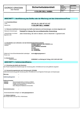 GIORGIO GRAESANAND FRIENDSSicherheitsdatenblattCode SDSANIMARevision 0Datum der Revision30.03.2020I COLORI DELL%u2018ANIMA Seite 1 von 9ABSCHNITT 1. Identifizierung des Stoffes oder der Mischung und des Unternehmens/Firma1.1. ProduktidentifikatorCode: AR-AA-AL-AM-AF-AV-AZBenennung I COLORI DELL%u2018ANIMA1.2. Relevante identifizierte Verwendungen des Stoffs oder Gemischs und Verwendungen, von denen abgeraten wirdRelevante Verwendungen: Farbstoff in L%u00f6sung. Nur zur professionellen AnwendungVerwendungen von denen abgeraten wird:Jede Verwendung, die nicht in diesem, noch in Abschnitt 7.3 genannt wird.1.3. Einzelheiten zum Lieferanten, der das Sicherheitsdatenblatt bereitstelltFirmenname GIORGIO GRAESAN AND FRIENDS s.a.s.Adresse Via BERGAMO 2420037 PADERNO DUGNANOITALIENTel. 02/9903951Fax. 02/99039590E-Mail der f%u00fcr das Sicherheitsdatenblatt zust%u00e4ndigen Person und, tecnico@giorgiograesan.it1.4. NotrufnummerTelefonnummer 02/99039541 von Montag bis Freitag, 8.30-12.30/14.00-18.00ABSCHNITT 2. Gefahrenidentifikation.2.1. Einstufung des Stoffs oder Gemischs.Das Produkt ist gem%u00e4%u00df den Bestimmungen der Verordnung (EG) 1272/2008 (CLP) als nicht gef%u00e4hrlich eingestuft..2.2. Kennzeichnungselemente nach Verordnung Nr.1272/2008.Gefahrenkennzeichnung gem%u00e4%u00df Verordnung (EG) 1272/2008 (CLP) und folgenden %u00c4nderungen und Anpassungen.Warnung: --Gefahrenpiktogramm: --Gefahrenhinweise:EUH210 Sicherheitsdatenblatt auf Anfrage erh%u00e4ltlich.EUH208 Enth%u00e4lt: 5-Chlor-2-methyl-2H-isothiazol-3-on;2-Methyl-2H-isothiazol-3-onKann allergische Reaktionen hervorrufen.Sicherheitshinweise: --Sicherheitsdatenblatt verf%u00fcgbar auf: www.giorgiograesan.it2.3. Weitere Gefahren.Das Produkt erf%u00fcllt nicht die PTB-/ vPvB-Kriterien