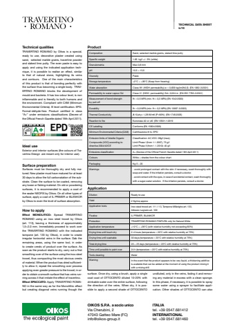 OIKOS S.P.A. a socio unicoVia Cherubini, 2 47043 Gatteo Mare (FC)info@oikos-group.itITALIAtel. +39 0547.681412INTERNATIONALtel. +39 0547.681460TECHNICAL DATA SHEET tr/10Technical qualitiesTRAVERTINO ROMANO by Oikos is a special, ready to use, decorative plaster created using sand, selected marble grains, travertine powder and slaked lime putty. The even paste is easy to apply and using the indicated application technique, it is possible to realise an effect, similar to that of natural stone, highlighting its veins and contours. One of the main characteristics of this product is that of bonding perfectly with the surface thus becoming a single body. TRAVERTINO ROMANO blocks the development of mould and bacteria. It has low odour level, is non inflammable and is friendly to both humans and the environment. Compliant with CAM (Minimum Environmental Criteria). III level certification. EPD. Formal-dehyde-free. Product certified in class %u201cA+%u201d under emissions classifications (Decree of the Official French Gazette dated 19th April 2011).Ideal useExterior and interior surfaces (the colours of Travertino Design are meant only for interior use). Surface preparationSurfaces must be thoroughly dry and fully matured. New plaster must have matured for at least 30 days to allow the full carbonatation of the substrate. Clean the surface to be coated, removing any loose or flaking material. On old or powdering surfaces, it is recommended to apply a coat of the sealer NEOFIX by Oikos. On all other types of surface, apply a coat of IL PRIMER or BLANKOR by Oikos to even the level of surface absorption.How to applyEffect MONOLITICO: Spread TRAVERTINO ROMANO using an inox steel trowel by Oikos (art. 113), leaving a thickness of approximately 1,5%u00f72,0 mm. Immediately proceed to work over the TRAVERTINO ROMANO with the indicated tampone (art. 133 by Oikos), in order to create irregular horizontal veins in the surface. Dab the remaining areas, using the same tool, in order to create crests of product over the surface. As soon as the product starts to dry, carry out a first smoothing over of the surface using the inox steel trowel, thus compacting the most obvious crests of material. When the product has dried sufficiently to allow it, repeat the smoothing over process applying even greater pressure to the trowel, in order to obtain a smooth surface that has veins running across it that imitate the effect of travertino. Effect SPACCATO: Apply TRAVERTINO ROMANO in the same way as for the Monolithic effect but creating diagonal veins running though the Composition Sand, selected marble grains, slaked lime putty Specific weight 1.65 kg/l +/- 3% (white) Granulometria Max 0,8 mmpH 12,5 %u00f7 13,5Viscosity PasteStorage temperature +2%u00b0C %u00f7 +36%u00b0C (Keep from freezing)Water absorption Class W1 (HIGH permeability) w = 0,639 kg/(m2h0,5) (EN 1062-3:2001)Permeability to water vapour Sd Class V1 (HIGH permeability) Sd= 0,024 m (EN ISO 7783-2:2001)Measurement of bond strength by pull-offfh = 0,5 MPA (min. fh > 0,3 MPA) (EN 1542:2000)Durability fh = 0,9 MPA (min. fh > 0,3 MPA) (EN 13687-3:2003)Thermal Conductivity 10,dry= 1,28 W/mK (P=90%) (EN 1745:2005)Reaction to fire Euroclass A2-s1,d0 (EN 13501-1:2019CE Labelling Conforms (EN 15824:2009)Minimum Environmental Criteria (CAM) Certificazione III liv. EPDEmission limits of Volatile Organic Compounds (VOC) according to directive 2004/42/CEClassification: A/l; VOC: 08g/l (max);Limit Phase I (from 1.1.2007), 75 g/lLimit Phase II (from 1.1.2010): 40 g/lEmissions classification A+ (Decree of the Official French Gazette dated 19th April 2011)Colours White + shades from the colour chartPackaging Kg 5 %u2013 20Warnings - avoid prolonged contact with the skin: if necessary, wash thoroughly with soap and water. If the irritation persists, consult a doctor. - avoid contact with the eyes, in case of accidental contact, wash thoroughly with a sugar-water solution. If the irritation persists, consult a doctor.Productsurface. Once dry, using a brush, apply a single coat coat of OTTOCENTO diluted 10-20% with drinkable water over the entire surface, following the direction of the veins. When dry, it is possible to apply a second shade of OTTOCENTO undiluted, only in the veins, fading it and removing any material in excess with a clean sponge. In this phase, if necessary, it is possible to spray some water using a sprayer to facilitate application. Other shades of OTTOCENTO can also ApplicationDilution Ready to useYield 2 Kg/mq approxApplication tools Inox steel trowel art. 111-113, Tampone Millerighe art. 133, Attrezzo Legnato art. 109 Fixative IL PRIMER, BLANKORProtection TRAVERTINO ROMANO FINITURA only for Natural WhiteApplication temperature +10%u00b0C %u00f7 +36%u00b0C (with relative humidity not exceeding 80%)Drying time until touch dry 2-4 hours (temperature = 20%u00b0C with relative humidity at 75%)Drying time until washable 30 days (temperature = 20%u00b0C with relative humidity at 75%)Total drying time 20 %u00f7 25 days (temperature = 20%u00b0C with relative humidity at 75%)Time until possible to paint over 24 h (temperature = 20%u00b0C with relative humidity at 75%)Tools cleaning WaterWarning In the event that the product appears to be very liquid, a thickening additive is available that can be added at the moment of using the product mixing it with a mixing drill