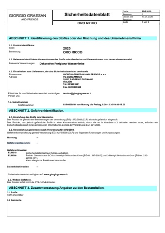 GIORGIO GRAESANAND FRIENDSSicherheitsdatenblattCode SDS2020Revision 0Datum der Revision17.04.2020ORO RICCO Seite 1 von 9ABSCHNITT 1. Identifizierung des Stoffes oder der Mischung und des Unternehmens/Firma1.1. ProduktidentifikatorCode: 2020Benennung ORO RICCO1.2. Relevante identifizierte Verwendungen des Stoffs oder Gemischs und Verwendungen, von denen abgeraten wirdRelevante Verwendungen: Dekorative Perlglanz-Wasserfarbe1.3. Einzelheiten zum Lieferanten, der das Sicherheitsdatenblatt bereitstelltFirmenname GIORGIO GRAESAN AND FRIENDS s.a.s.Adresse Via BERGAMO 2420037 PADERNO DUGNANOITALIENTel. 02/9903951Fax. 02/99039590E-Mail der f%u00fcr das Sicherheitsdatenblatt zust%u00e4ndigen Person und, tecnico@giorgiograesan.it1.4. NotrufnummerTelefonnummer 02/99039541 von Montag bis Freitag, 8.30-12.30/14.00-18.00ABSCHNITT 2. Gefahrenidentifikation.2.1. Einstufung des Stoffs oder Gemischs.Das Produkt ist gem%u00e4%u00df den Bestimmungen der Verordnung (EG) 1272/2008 (CLP) als nicht gef%u00e4hrlich eingestuft.Das Produkt, das jedoch gef%u00e4hrliche Stoffe in einer Konzentration enth%u00e4lt, durch die es in Abschnitt n.3 deklariert werden muss, erfordert ein Sicherheitsdatenblatt mit angemessenen Informationen gem%u00e4%u00df der Verordnung (EU) 2015/830.2.2. Kennzeichnungselemente nach Verordnung Nr.1272/2008.Gefahrenkennzeichnung gem%u00e4%u00df Verordnung (EG) 1272/2008 (CLP) und folgenden %u00c4nderungen und Anpassungen.Warnung: --Gefahrenpiktogramm: --Gefahrenhinweise:EUH210 Sicherheitsdatenblatt auf Anfrage erh%u00e4ltlich.EUH208 Enth%u00e4lt: Gemisch aus 5-Chlor-2-methyl-2H-isothiazol-3-on [EG-Nr. 247-500-7] und 2-Methyl-2H-isothiazol-3-on [EG-Nr. 220-239-6] (3:1).Kann allergische Reaktionen hervorrufen.Sicherheitshinweise: --Sicherheitsdatenblatt verf%u00fcgbar auf: www.giorgiograesan.it2.3. Weitere Gefahren.Das Produkt erf%u00fcllt nicht die PTB-/ vPvB-KriterienABSCHNITT 3. Zusammensetzung/Angaben zu den Bestandteilen.3.1 Stoffenicht anwendbar3.2 Gemische