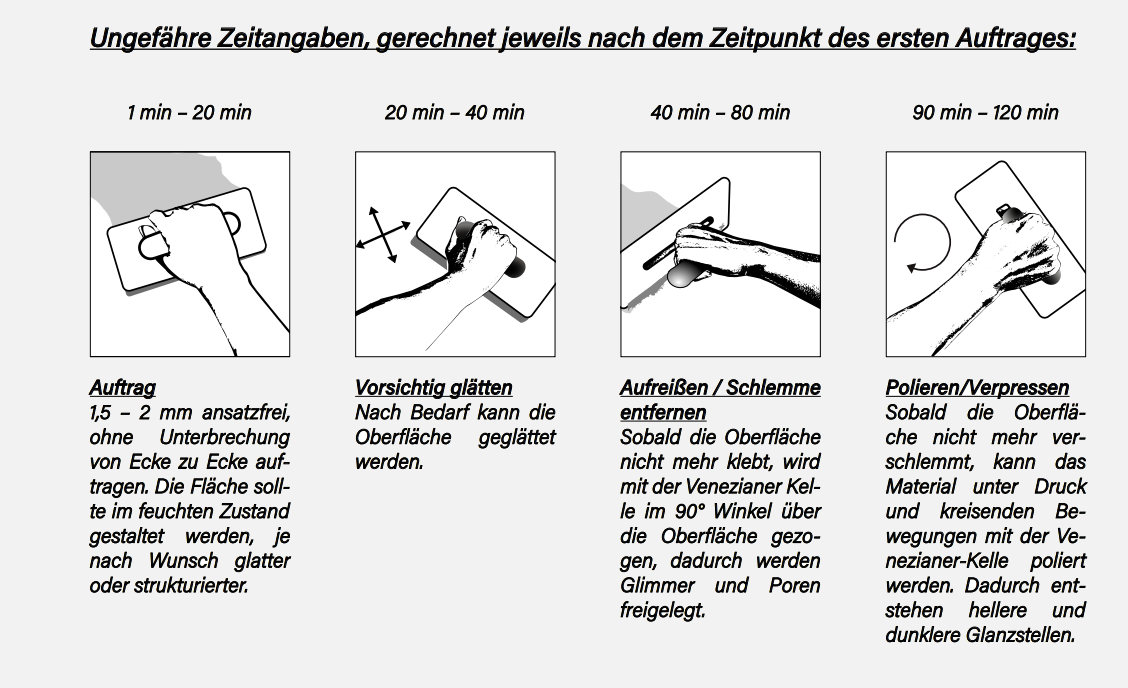 Die einzigartige Beschichtung mit ihrer speziellen Textur changiert in unterschiedlichsten Lichteffekten und lässt sich durch Techniken wie Schablonieren, Prägen, Lasieren, Marmorieren oder Pigmentieren (Endkaustik) noch weiter veredeln.